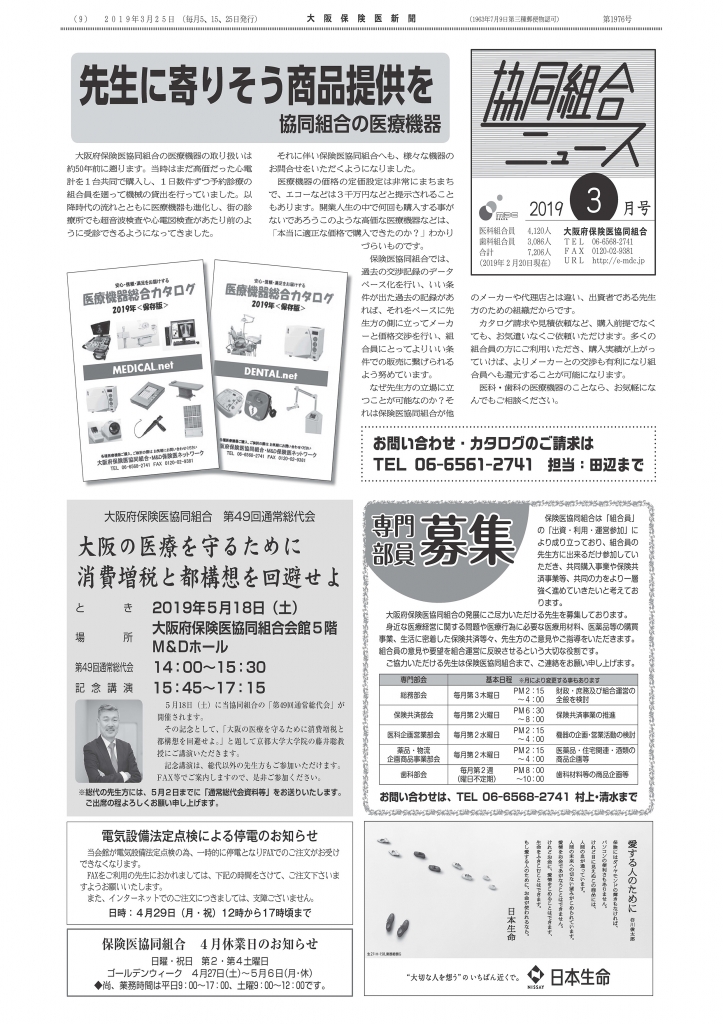 今号は、協同組合の「医療機器」のご案内です。 先生の立場で交渉します。医療機器は保険医協同組合へおまかせください。今号は、協同組合の「医療機器」について掲載しました。 紙面をダウンロード 前へ 一覧に戻る 次へ