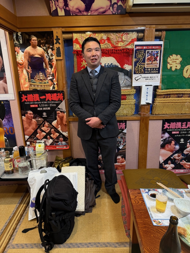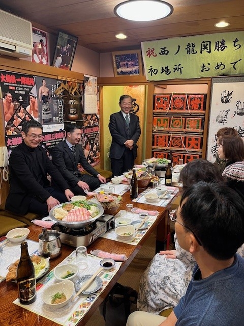 2026年2月28日18時より、現役行司の式守与之吉さん(以下、与之吉さん)をお招きし、日本橋にある元力士が営む人気店ちゃんこ西乃龍にて特別交流会を開催いたしました。