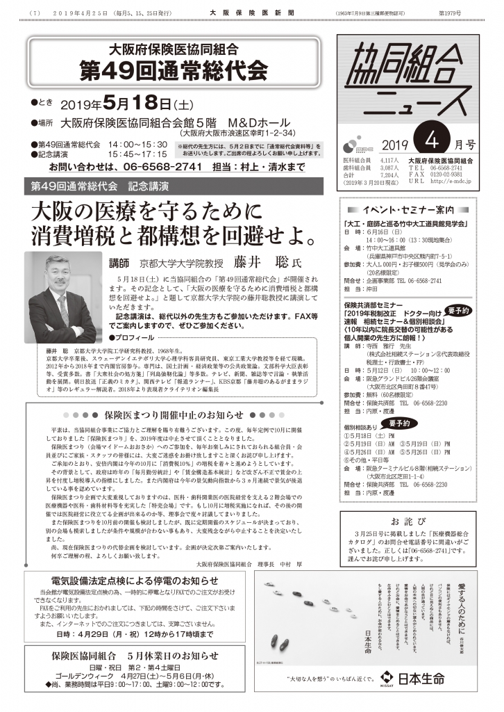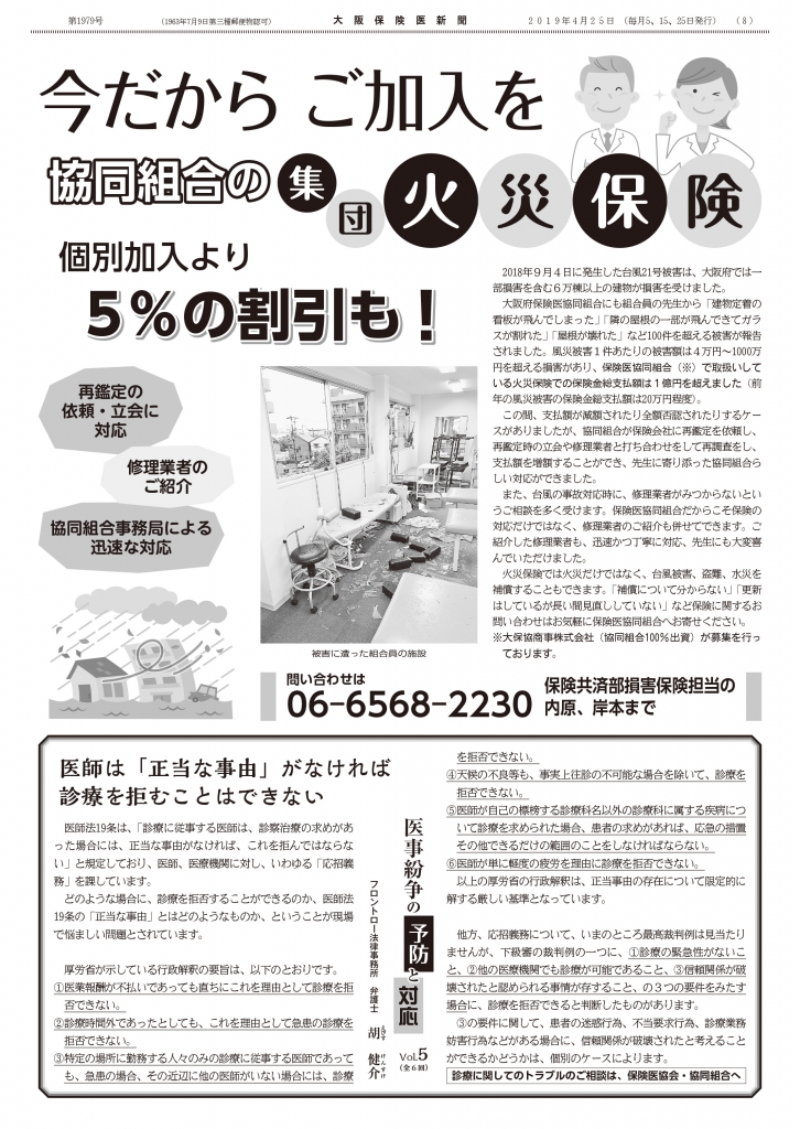 5月18日(土)に開催される「第49回通常総代会 記念講演」のご案内と、台風21号による当組合でご加入頂いている火災保険のお支払い等に関する報告です。 5月18日(土)に開催される「第49回通常総代会 記念講演」のご案内と、昨年9月に発生した台風21号による被害で、当組合でご加入頂いている火災保険の保険金お支払い等に関する報告を掲載しています。 紙面をダウンロード 前へ 一覧に戻る 次へ