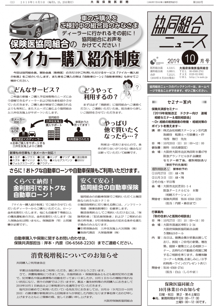今号は「マイカー購入紹介制度」のご案内です。 マイカー購入時、ディーラーに行かれる前に大阪府保険医協同組合にご連絡ください。「マイカー購入紹介制度」・・・あまり知られていない協同組合の特典です。 紙面をダウンロード 前へ 一覧に戻る 次へ
