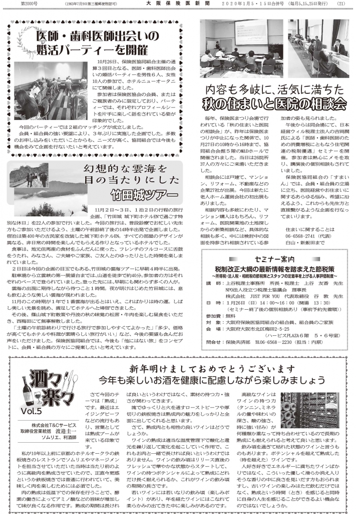 新年あけましておめでとうございます。 新年あけましておめでとうございます。 新年号は、旅行企画「竹田城ツアー」と医師・歯科医師の「婚活パーティー」の報告です。 紙面をダウンロード 前へ 一覧に戻る 次へ